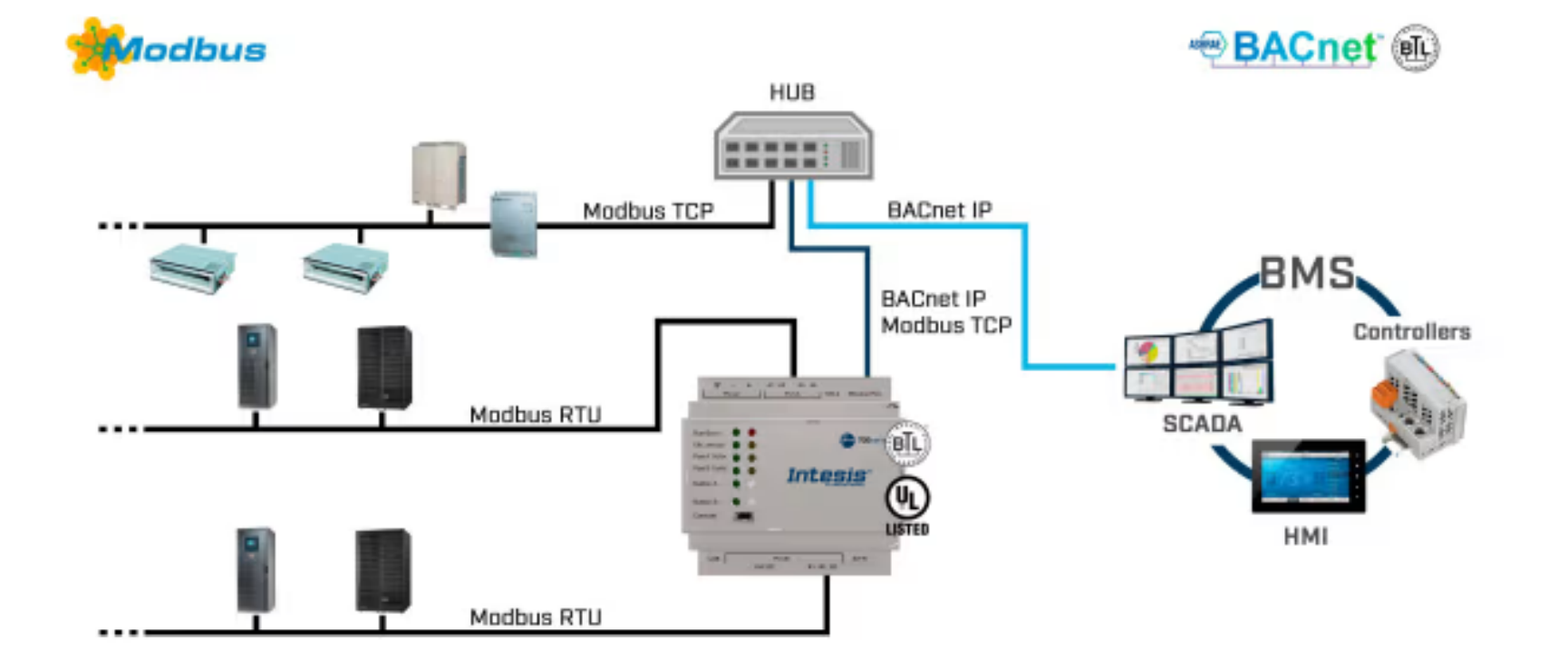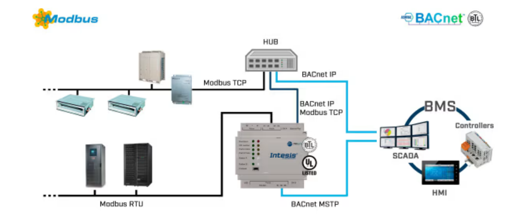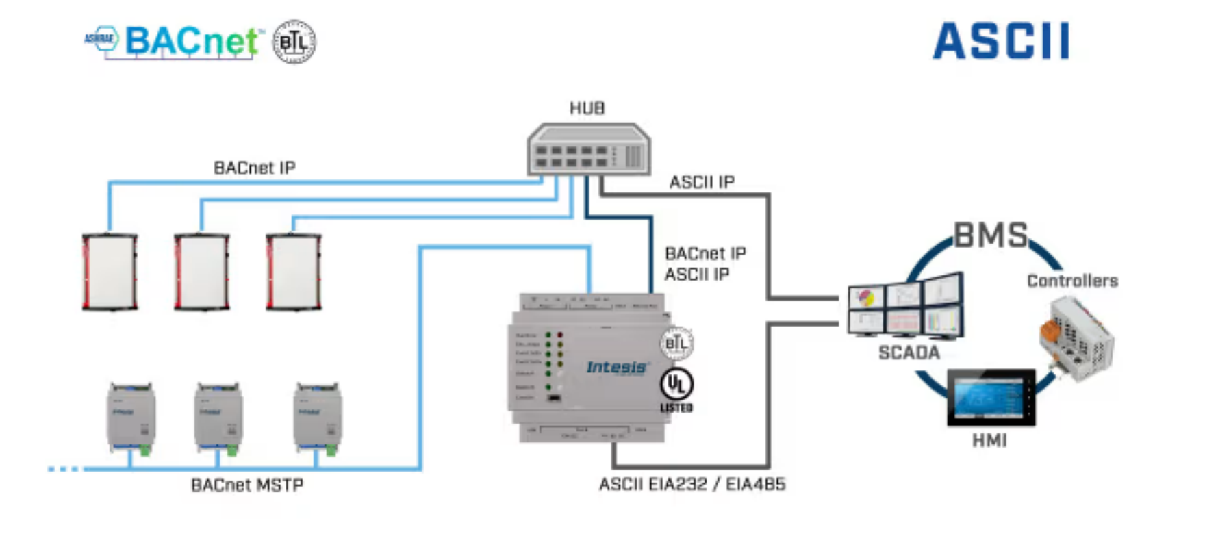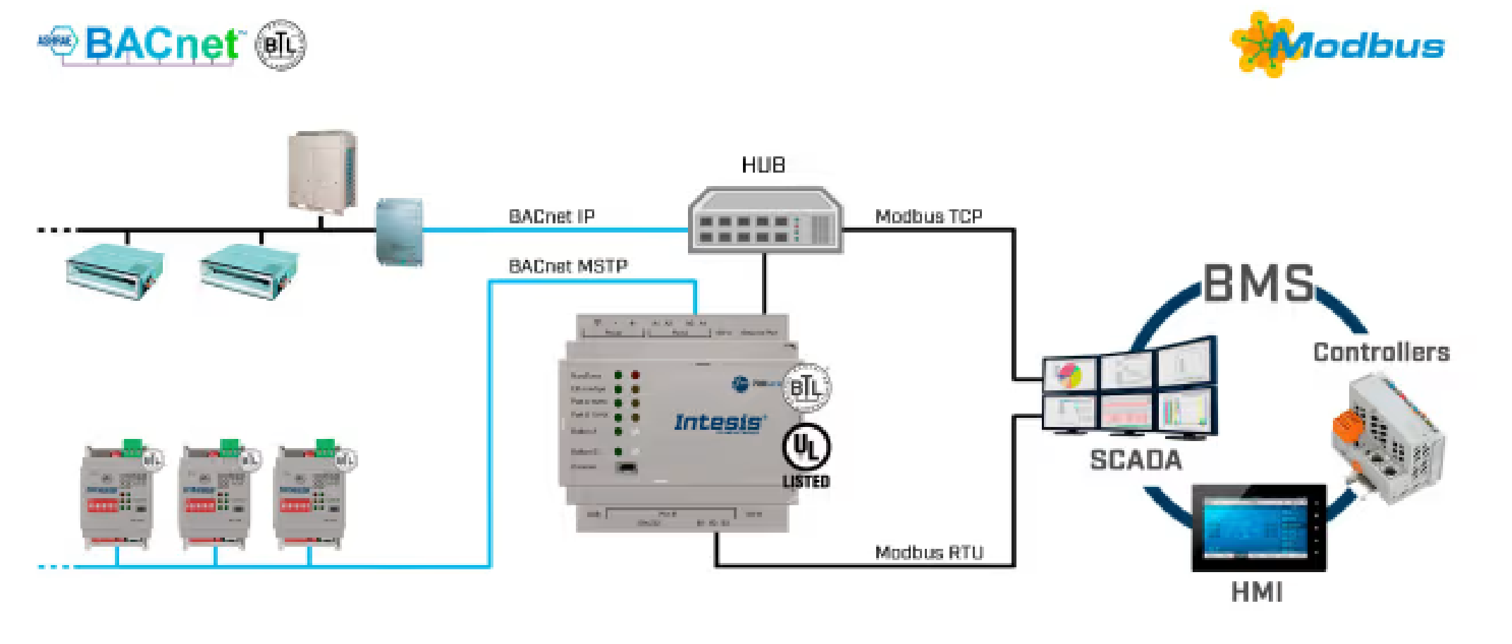 Brama oferuje wsparcie dla protokołów BACnet/IP i BACnet MS/TP oraz równoczesną obsługę Modbus TCP i Modbus RTU. Dzięki funkcji BACnet Explorer możliwe jest automatyczne wyszukiwanie i skanowanie urządzeń w sieci, co znacząco ułatwia konfigurację. Obsługa do 6 jednoczesnych klientów Modbus TCP zapewnia stabilność pracy nawet w złożonych instalacjach, w których wiele systemów nadrzędnych komunikuje się równolegle. Konfiguracja odbywa się poprzez intuicyjne środowisko Intesis MAPS, które umożliwia import gotowych szablonów, automatyczne sprawdzanie poprawności projektu oraz szybkie aktualizacje firmware’u.