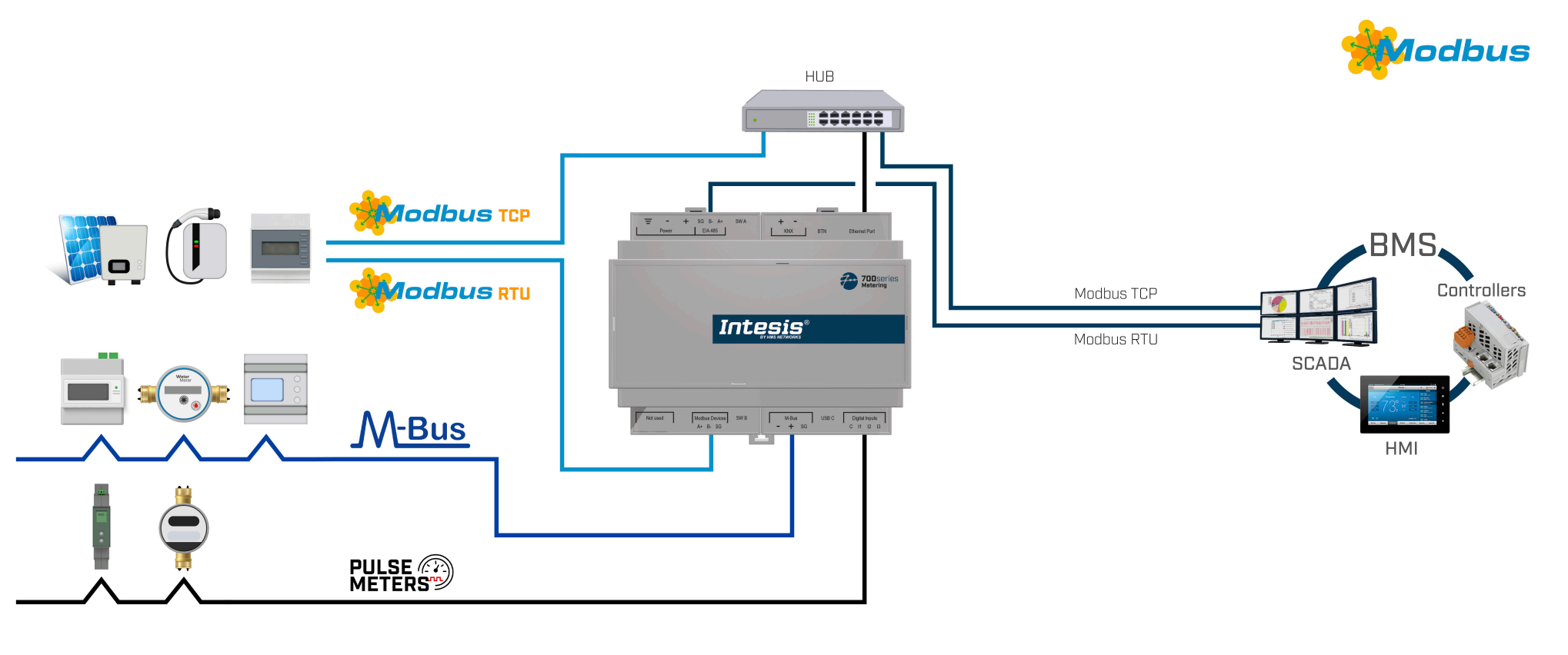 - Integration of M-Bus, Modbus RTU/TCP and pulse meters in one device
