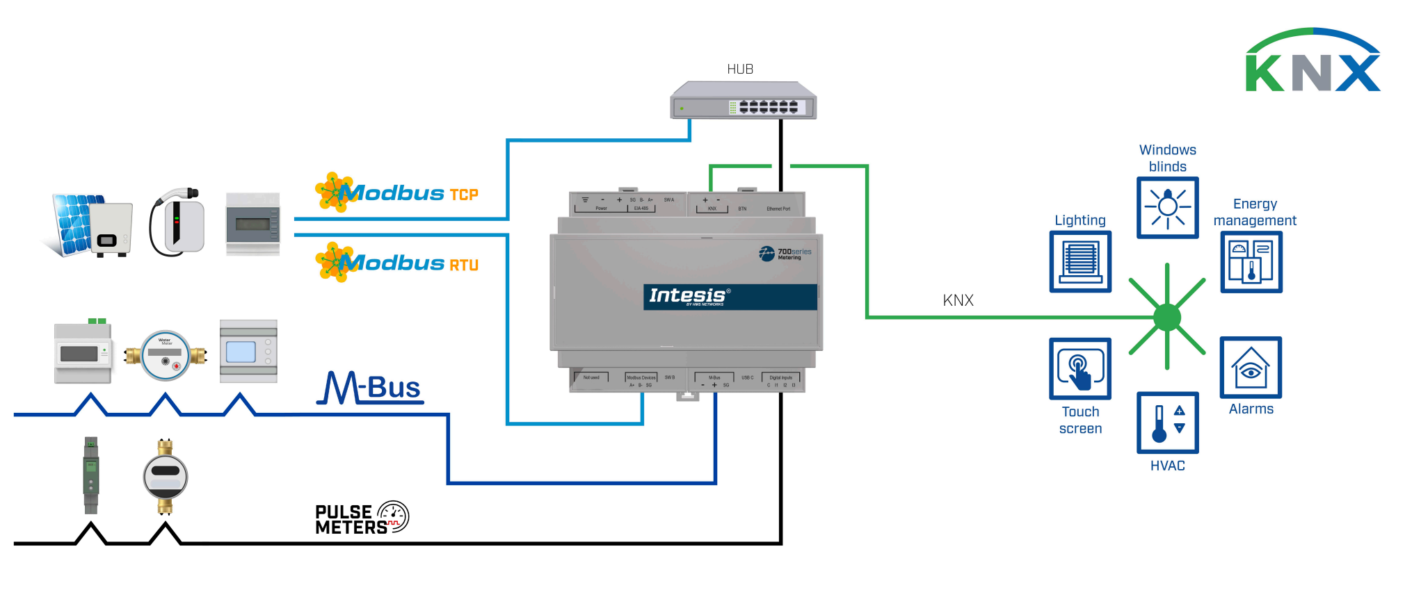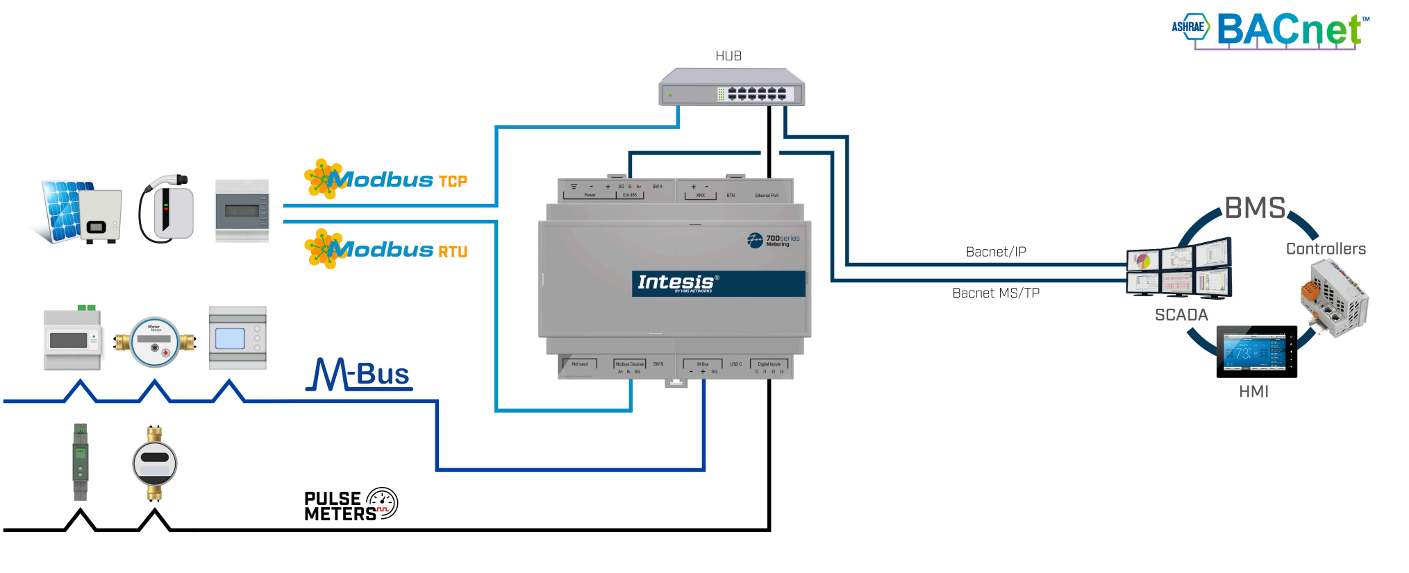 IN702MEB0600000 is the most advanced gateway in the Intesis 700series Metering Gateway family, designed for integrating M-Bus meters, Modbus RTU/TCP devices and pulse meters into BMS and SCADA systems based on Modbus, KNX and BACnet. It supports up to 60 meters and a maximum of 3000 signals, making it the ideal choice for large-scale and complex commercial, industrial, and public sector installations. The embedded M-Bus level converter eliminates the need for additional hardware, reducing system costs and simplifying design. Acting as an M-Bus master and as a server on the IP side, the gateway provides reliable bidirectional integration of electricity, water, gas, and heat meters.