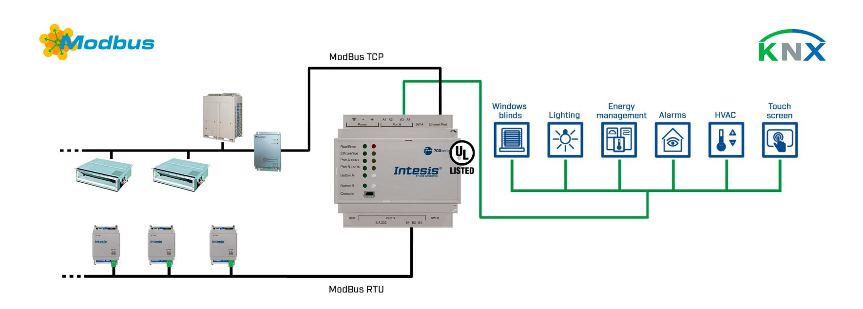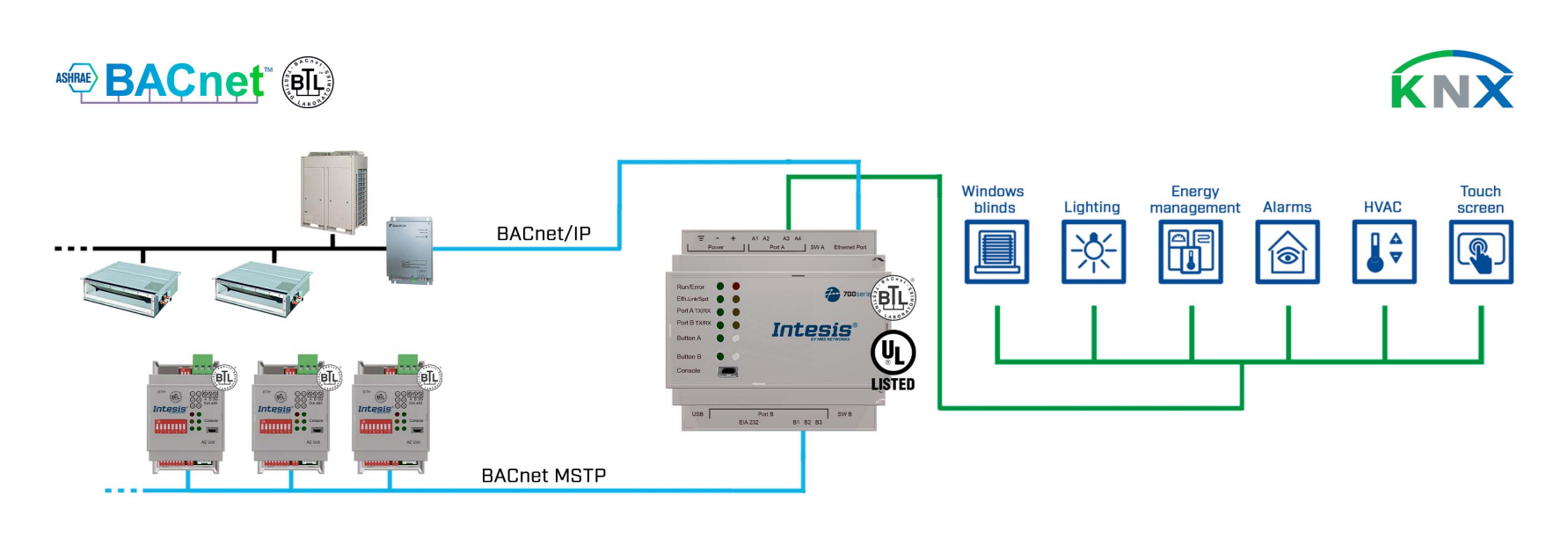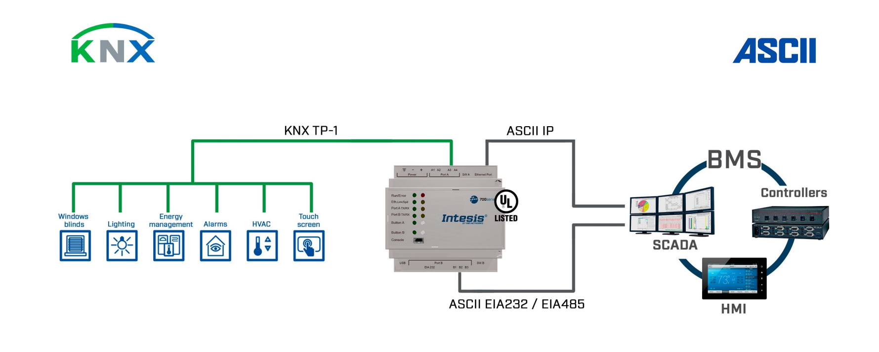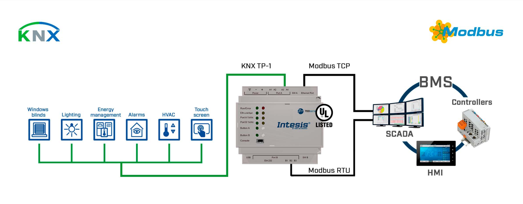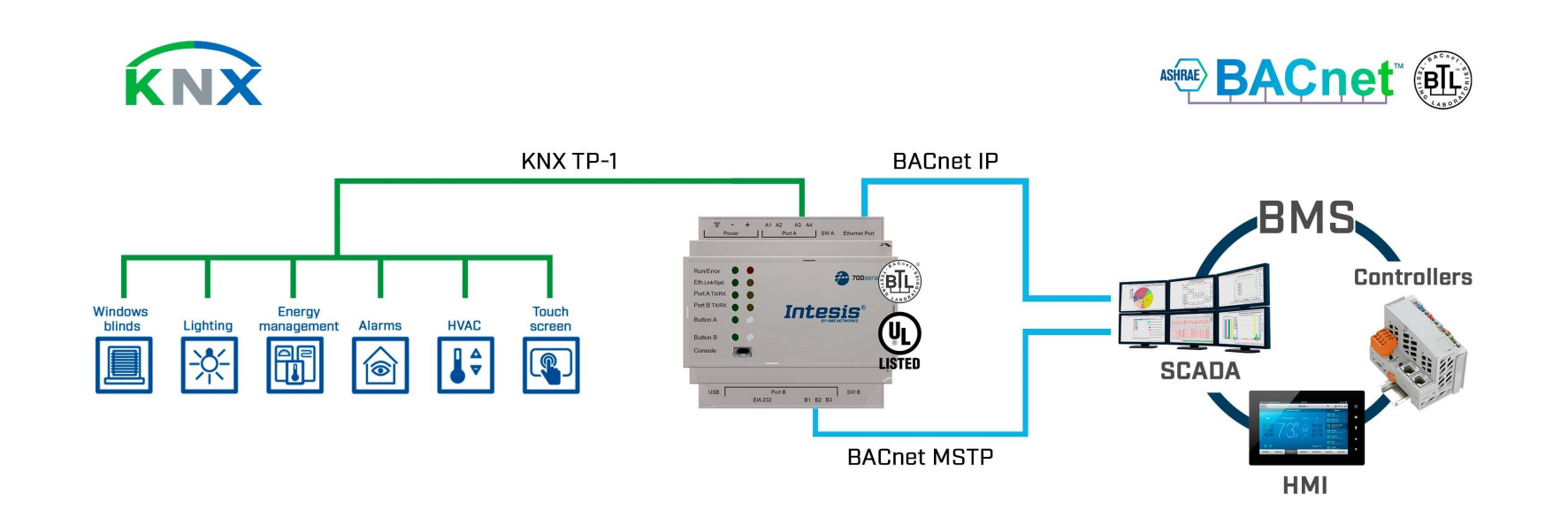 - Integracja KNX TP z Modbus TCP/RTU, BACnet/IP, BACnet MS/TP i ASCII