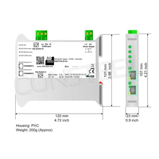 Industrial BACnet IP master to J1939 converter, housing type: A (slim), DIN rail mount.